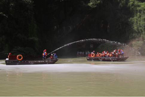 13日上午,參與演練的工作人員在蒲花暗河碼頭前列隊集合,演練由指揮組、應急救援組、醫療救護組、后勤保障組、通訊聯絡組等組成。本次水上應急演練,主要以溺水事故、游船起火事故為案例,對現場警戒、搶險救援、傷員救治等工作進行實戰演練,演練全程嚴肅認真,過程緊張有序,達到演練預期效果,取得了圓滿成功。