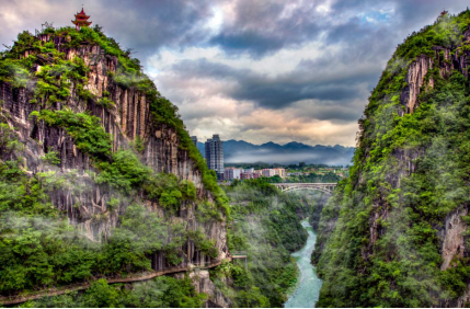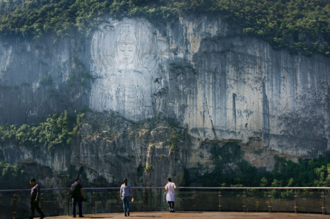 高123米世界最高巨幅摩崖觀音像,黔江河水在峽底潺潺流淌。