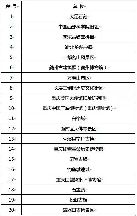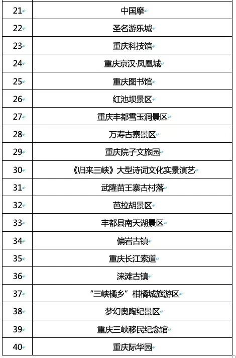 專家們從84個入圍地標名單中認真審核,最終產生文旅新地標40強。以下是第二屆重慶文旅新地標獲獎名單(排名不分先后)。