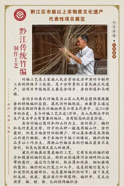 黔江區報送的《白土棕編》《白土嗩吶制作技藝》《土法制香》《黔江區王氏牛皮鼓制作技藝》《王氏灶臺建造技藝》《黔江傳統竹編》《官村麻糖制作技藝》《陸氏中藥酒曲傳統制作技藝》《土家婚俗》《土苗喪葬禮儀》十個項目成功獲批。