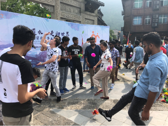 (圖為留學生們體驗中國民間傳統游戲踢毽子)
