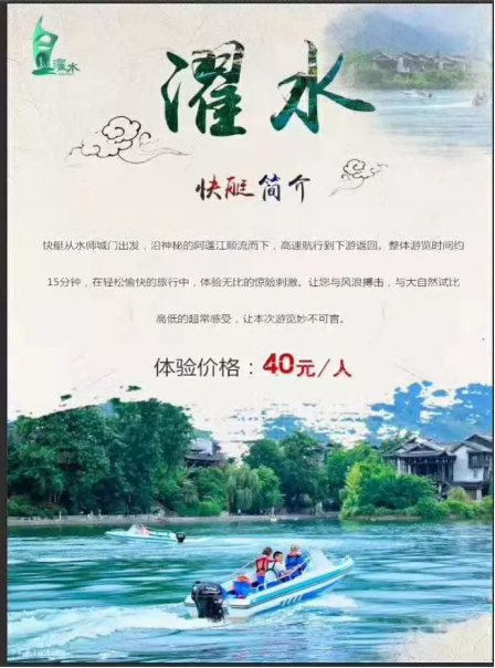 濯水景區水上游樂項目——快艇,從政府大道外水師城門出發,沿阿蓬江順流而下,高速航行至下游返回,整個游覽時間約15分鐘。