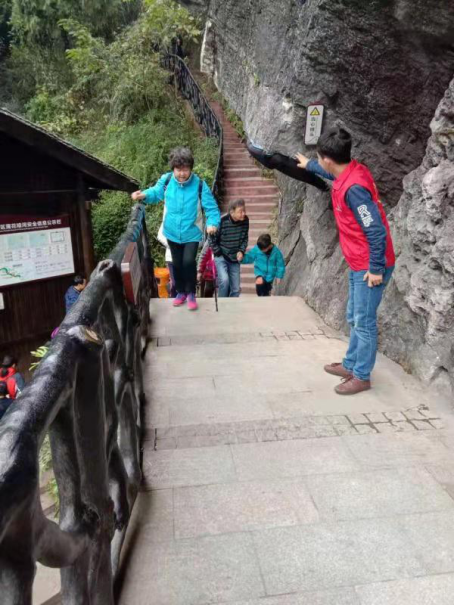 “您好”“請”“謝謝”“您辛苦了”這些看似簡單的文明用語,時常在游客朋友耳邊響起。一位腿腳不方便的游客朋友想過馬路到游客服務(wù)中心,但是地下通道要經(jīng)過樓梯,志愿者趕緊主動上前指引游客,親手推著游客通過特殊人群通道過馬路。
