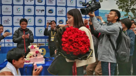 摘得本次比賽42公里男子組冠軍的駱濤沖過終點(diǎn)以后,單膝跪地,向在終點(diǎn)等候自己的女朋友求婚!