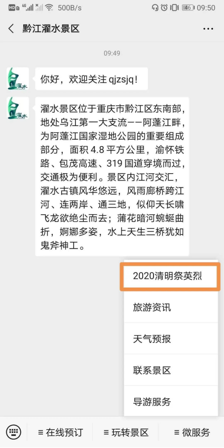 2.關注黔江濯水景區微信公眾號,點擊底端菜單欄微服務”——“2020清明祭英烈活動入口: