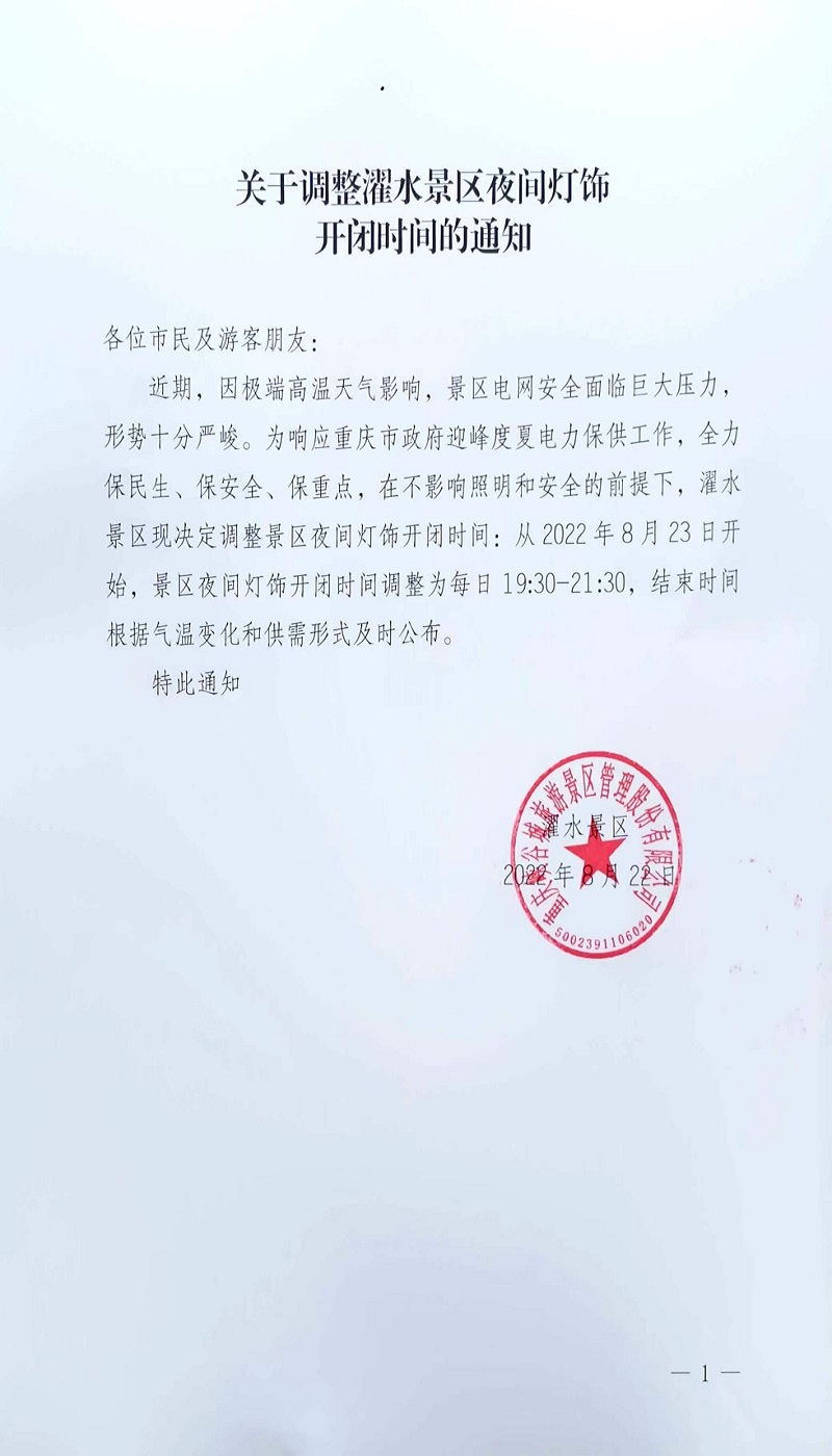 關于調整濯水景區夜間燈飾開閉時間的通知