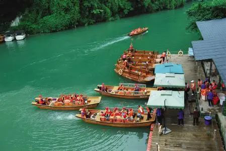 來暗河感受三天兩夜穿越之旅。一艘艘的游船躺在水面上,水綠得像是碧玉那般。