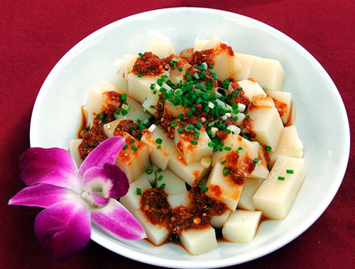此菜潤滑鮮嫩、酸辣可口。它是用大米淘洗浸泡后加水磨成米漿,然后加堿熬制,冷卻,形成塊狀“豆腐”即成。食用時(shí)切成小片放入涼水中再撈出,盛入容器后,將切好的大頭菜、鹽菜、酥黃豆、酥花生、蔥花等適合..